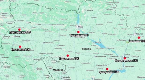 В Кремле подчеркнули, что Зеленский и его команда сами сделали этот удар неизбежным.Карта крупных украинских ТЭС, которые рассматриваются как наши приоритетные цели//Инфографика Царьграда: "Гугл. Карты"