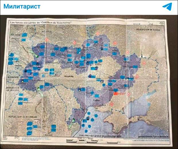 И хотя официально это преподносится как "гарантии безопасности", в Москве уже дали понять: любая попытка ввода войск НАТО встретит жёсткий ответ.Как утверждает Mash, хакеры из KillNet взломали локальную сеть канцелярии Вооружённых сил Франции и вытащили на свет карту от 16 апреля 2025 года. Название — Les forces conjointes de "Coalition de Volontaires" ("Объединённые силы Коалиции желающих"). На карте — схема размещения иностранных войск на Украине, а в углу — имя ответственного: генерал Тьерри Буркхардт, бывший начальник Главного штаба ВС Франции.