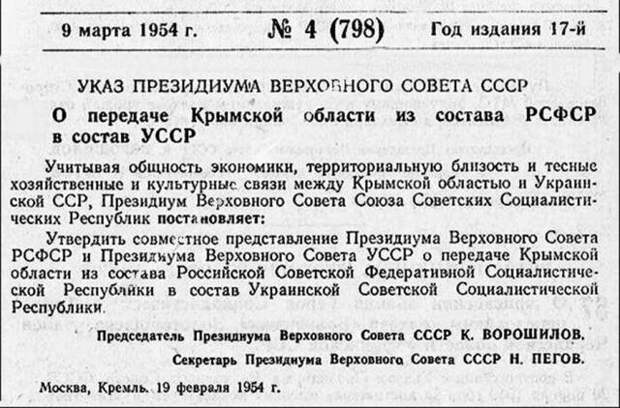 Достаточно привести такой факт. Указ Президиума Верховного Совета СССР "О передаче Крымской области из состава РСФСР в состав УССР" от 19 февраля 1954 года был принят на основании соответствующего обращения Президиума Верховного Совета Украинской ССР. Но все дело в том, что Президиум Верховного Совета УССР не имел полномочий инициировать такое обращение. Согласно Конституции УССР, вопросы изменения территориального состава республики и создания в составе Украинской ССР новых областей относились исключительно к прерогативе Верховного Совета УССР. Следовательно, украинские коммунисты нарушили законодательство и тем самым сделали незаконной передачу Крымской области Украине. Причем это было далеко не единственное нарушение.