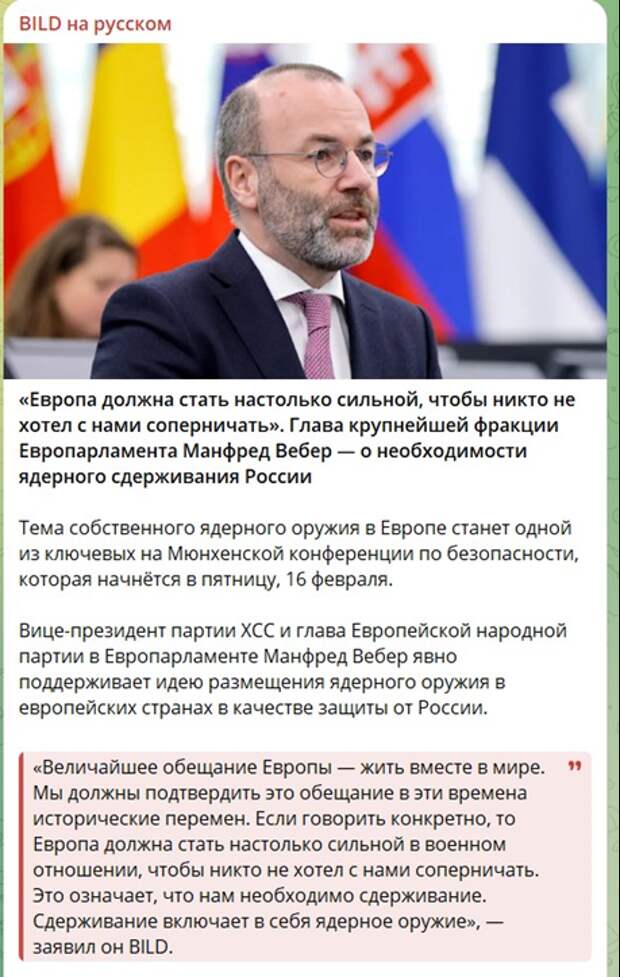 Издание «Бильд», будучи верноподданным самым отмороженным и авантюристическим кругам правителей Запада, всегда держит нос по ветру и усердно «прокачивает» все новейшие тренды западной массовой пропаганды. В то числе и этот – о крайней необходимости заиметь собственную ядерную бомбу. Вроде бы для Европы, но в подтексте явно читается, что для любимого фатерлянда. Которому только этого не хватало.