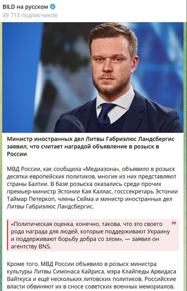 Самое смешное в самопрезентации этого молодого Ландсбергиса, которому, видимо в рамках образцовой литовской «демократии», его красивая должность упала прямо из рук его ясновельможого дедули, заключается в том, что деятель, ничтоже сумняшеся, гордится тем, что «это своего рода награда для людей, которые поддерживают Украину». Стоит напомнить этому фрику, что он вообще–то работает министром государства под названием Литва. И ему стоило бы поддерживать в первую очередь не Украину, а собственную страну.