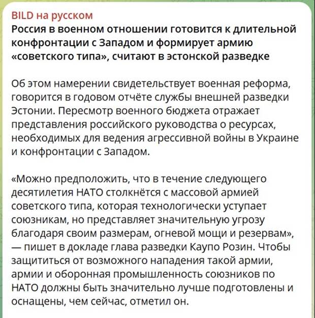 «Газета WELT** am SONNTAG опубликовала интервью с генеральны инспектором бундесвера Карстеном Бройером, который заявил, что германская армия должна быть готова к войне уже через пять лет. О возможном конфликте России с НАТО он сказал: «Для этого прежде всего нужно такое намерение. Я вижу его у Путина, судя по тому, что он говорит и пишет, а также по его действиям в Украине.»
