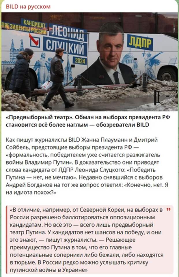 В рамках специфического немецкого восприятия, где Германия и Европа «цветущий сад», а все остальное дикие, непролазные джунгли, предстоящие российские выборы уже заранее объявлены ненастоящими , потому что «Ахтунг!» – «его главные потенциальные соперники либо бежали либо находятся в тюрьме».
