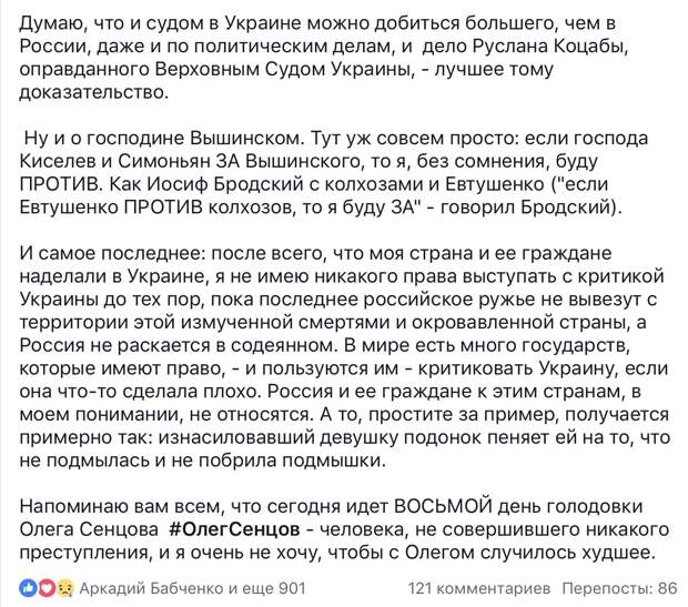 Напомню, что Сенцов осуждён за терроризм. И он ничем не отличается от тех украинских террористов, которые утюжат сейчас Горловку. А эта старая манда, живущая в России, возводит в ранг героя, одевает венец мученика и делает икону из террориста. Ибо враг России — её друг.