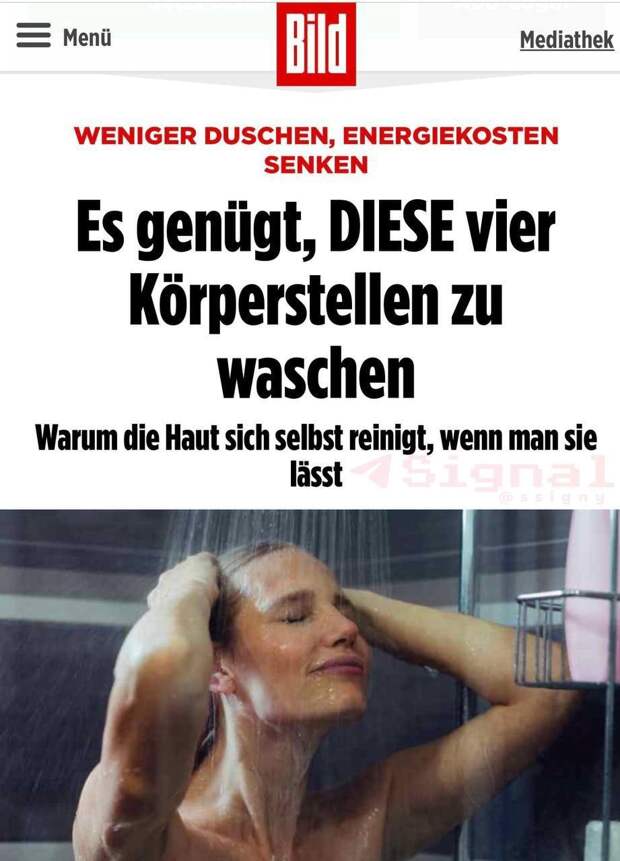1. В немецком журнале Бильд вышла статья под заголовком — «Достаточно вымыть эти четыре части тела. Почему кожа сама себя очищает». Похоже немцы всерьёз готовятся прикрутить газ и сидеть грязными, в темноте. Или, точнее, обычные немцы готовятся.